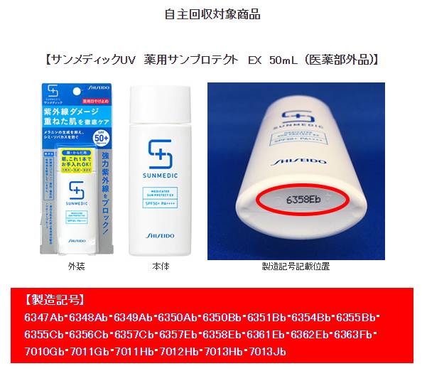 資生堂這次回收的防曬霜,一款是適用于敏感肌的SUNMEDIC藥用保濕防曬霜,50ml瓶裝。瓶底有制造編碼,該防曬霜大約需要回收6萬瓶。