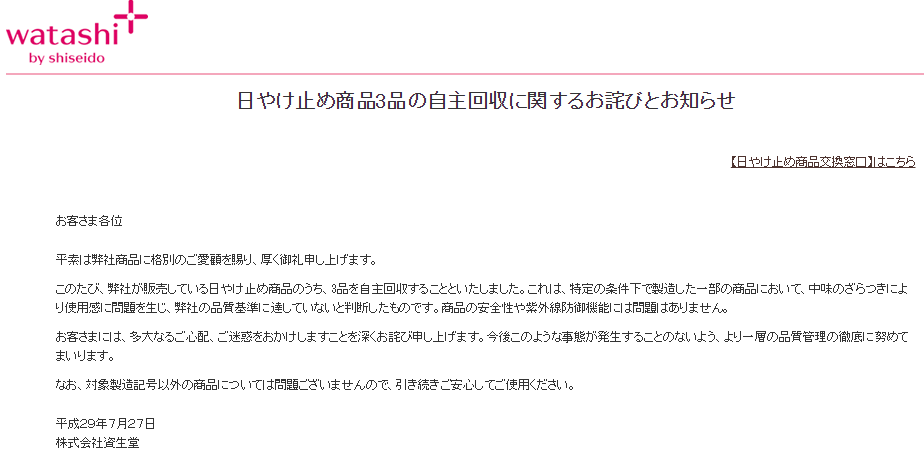 7月27日,日本資生堂官網(wǎng)發(fā)布了回收2款防曬霜的消息。并表示,這2款產(chǎn)品是在特定情況下制造出來的,使用感有一些粗糙,不符合資生堂的品質(zhì)標(biāo)準(zhǔn)。但產(chǎn)品的性和紫外線防御功能都沒有問題。
