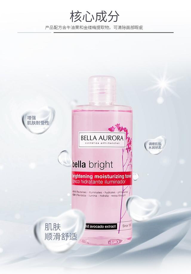 配方中含有牛油果和金縷梅提取物,可清除面部瑕疵;脫色活性成分與Bella Aurora的祛斑護(hù)理產(chǎn)品相輔相成,可更好的減少皮膚色斑和瑕疵。不含酒精,所以不會(huì)產(chǎn)生刺激感。