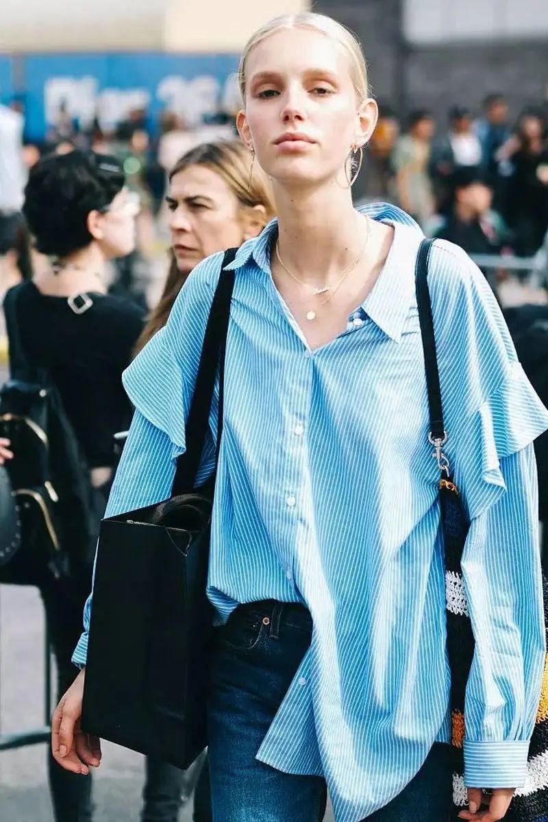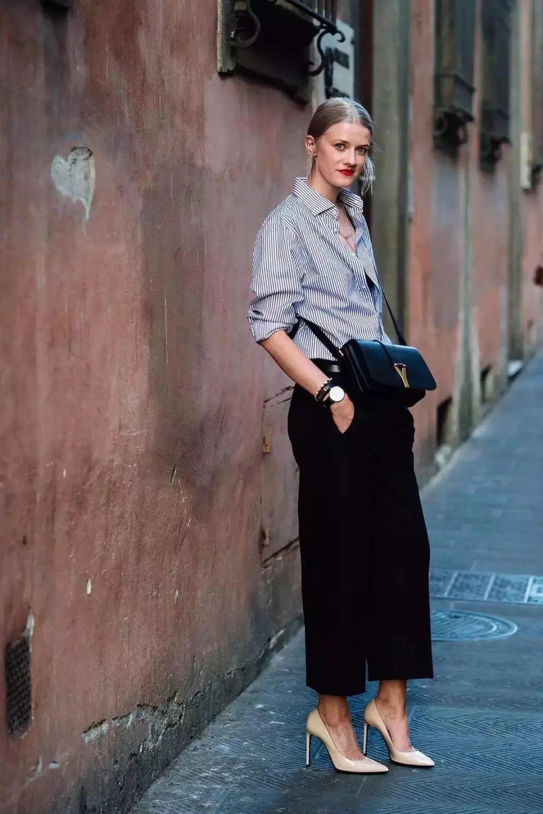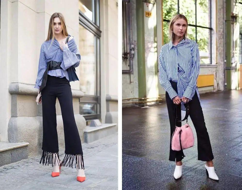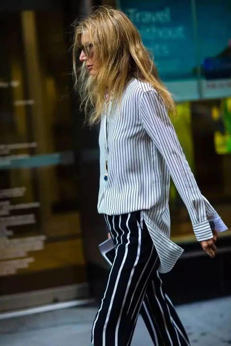 條紋襯衫搭配闊腿褲就是很少踩雷的一個(gè)選擇。不規(guī)則的前后擺設(shè)計(jì)、V口高跟鞋或者平底鞋都能相得益彰,自成風(fēng)格。