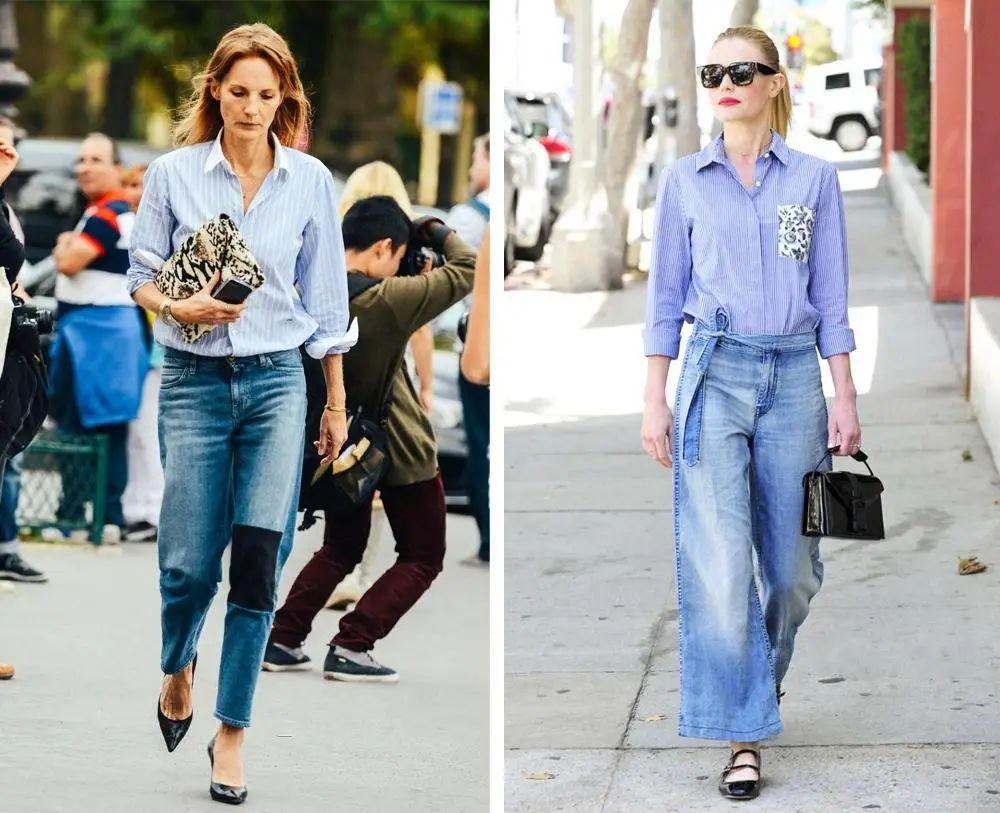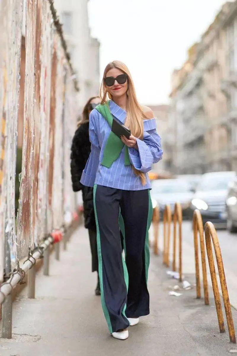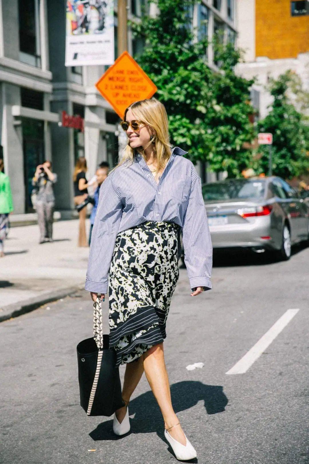 條紋襯衫搭配闊腿褲就是很少踩雷的一個(gè)選擇。不規(guī)則的前后擺設(shè)計(jì)、V口高跟鞋或者平底鞋都能相得益彰,自成風(fēng)格。
