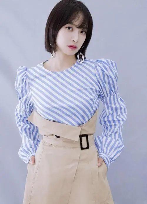 藍(lán)白條襯衫+小圓領(lǐng)設(shè)計(jì),干凈大方又很有少女感。羊腿袖有修飾手臂線條的作用,同時(shí)也讓造型增加了立體線條感;用草木綠搭配藍(lán)白條紋襯衫清新又減齡。