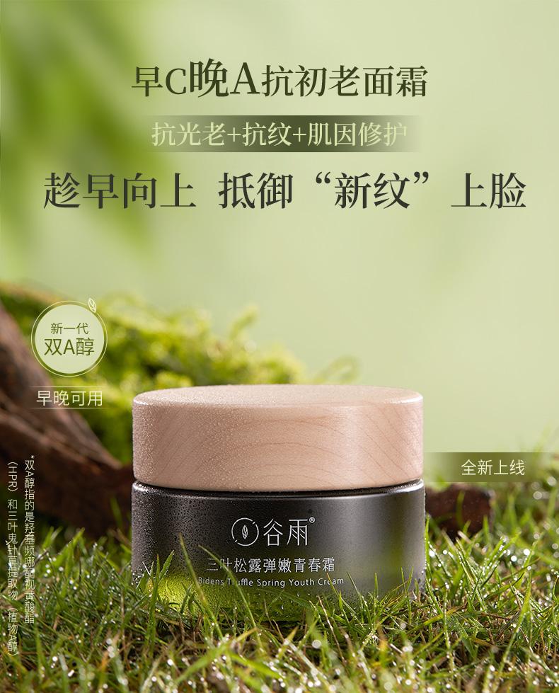 谷雨近日推出三葉松露面霜,整體包裝為通透的綠色漸變玻璃瓶身,質(zhì)地水潤(rùn)輕盈不油膩。