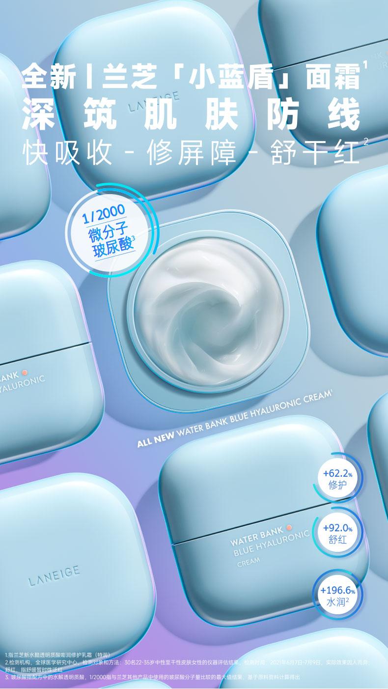 蘭芝近日推出全新小藍(lán)盾面霜,整體包裝以淺藍(lán)色為基調(diào),外形設(shè)計(jì)靈感源自人體工學(xué),45°單手可輕松開(kāi)罐。