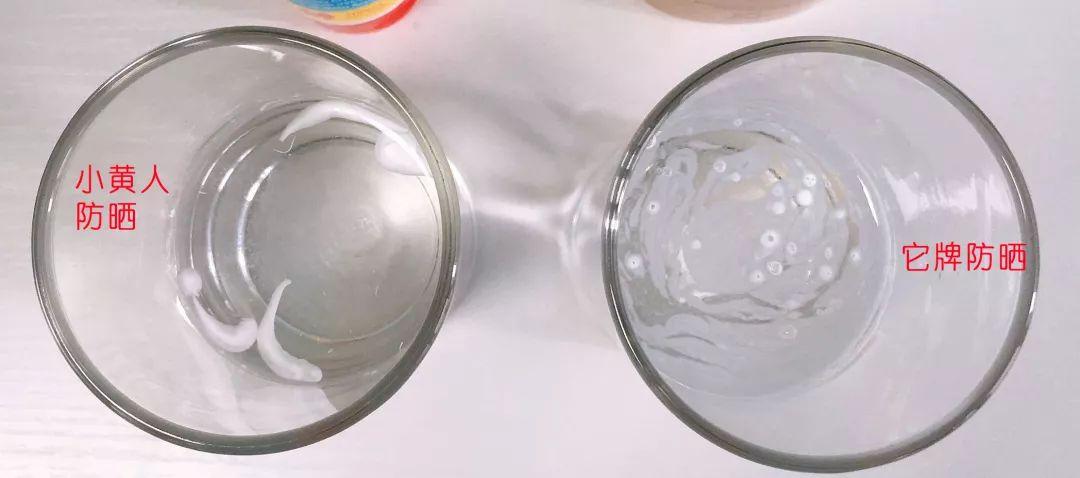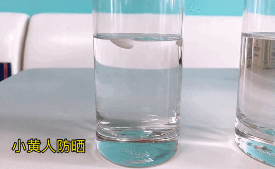 把不同的防曬分別投入水中,小黃人的霜體全部浮在水面上,而對比組的霜體秒沉水……說明小黃人的密度比水小,它牌防曬的密度比水大。