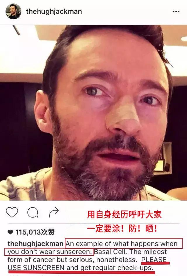金剛狼休·杰克曼這個土生土長的悉尼人,就不幸中了招。甚至在接下來的3年內(nèi)6次復(fù)發(fā)!他甚至在ins上分享自己的經(jīng)歷以呼吁大家要注意防曬!