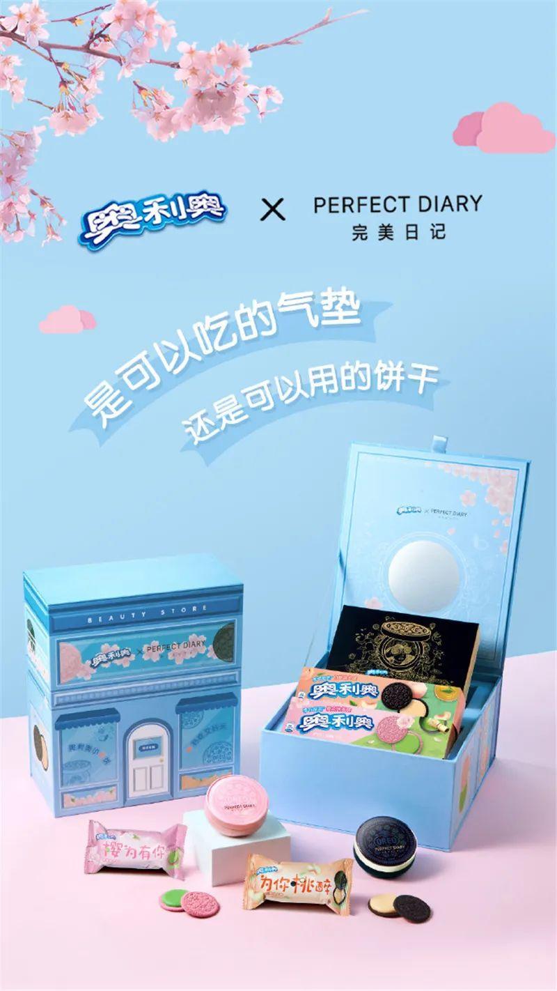 此外兩個(gè)品牌還打造了“美妝小鋪”的限定禮盒,禮盒包含了兩款氣墊、櫻花抹茶味奧利奧和白桃烏龍味奧利奧。包裝設(shè)計(jì)上以藍(lán)色為主色調(diào),將櫻花、餅干等元素融入其中,內(nèi)置化妝鏡,給消費(fèi)者既好玩又好吃的體驗(yàn)。