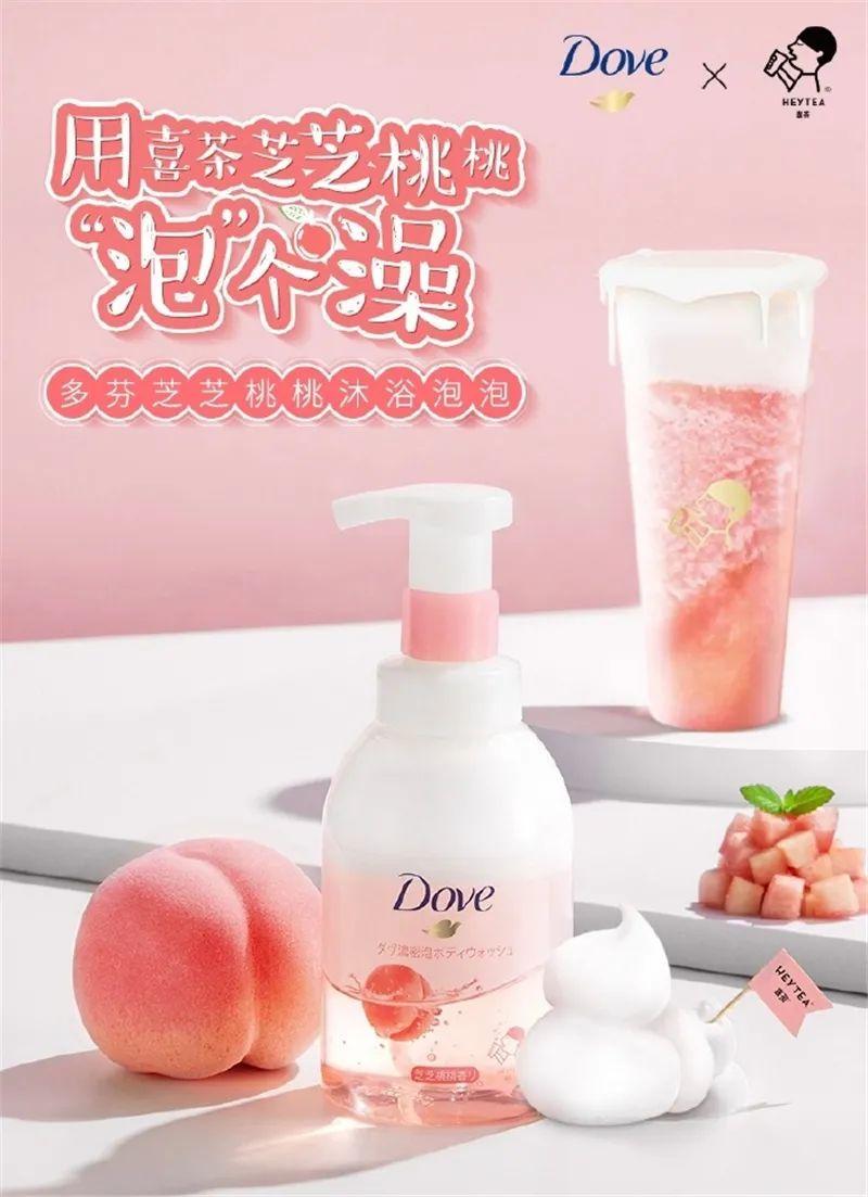 今年5月多芬與喜茶聯(lián)名推出了多芬芝芝桃桃沐浴泡泡,靈感來(lái)源于喜茶芝芝桃桃的“芝士”與“桃汁”的搭配。產(chǎn)品的整體造型上也采用了上下分層設(shè)計(jì),上層是豆汁“奶蓋”泡泡,下層是含蜜桃提取物維生素的“桃汁”沐浴乳。整體色調(diào)上也和芝芝桃桃一樣粉粉嫩嫩的,充滿少女心。