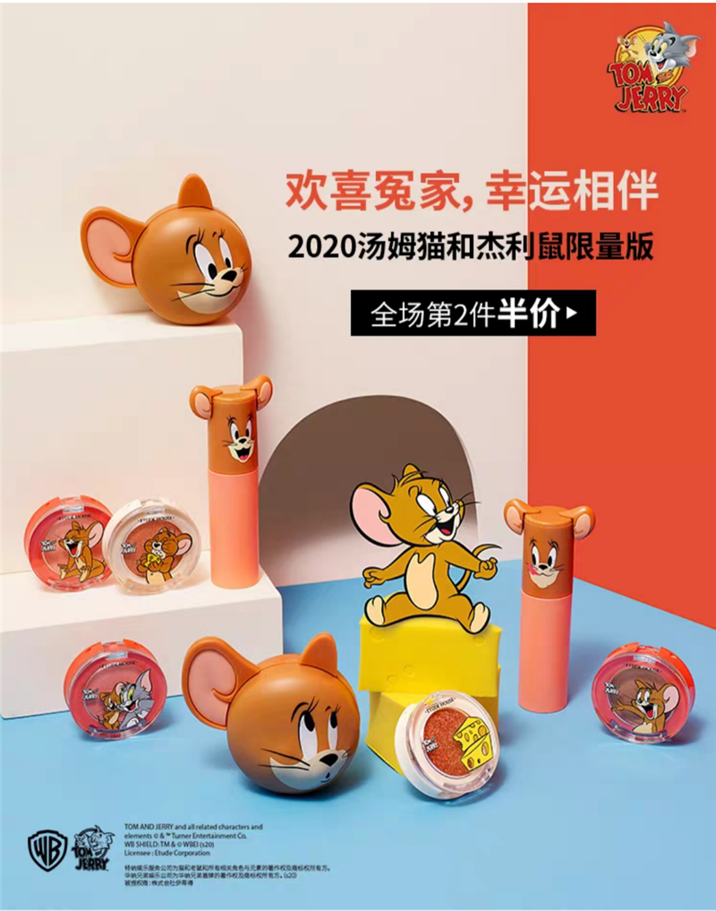 韓國(guó)愛茉莉集團(tuán)旗下品牌伊蒂之屋聯(lián)合經(jīng)典IP《貓和老鼠》推出了“LUCKY TOGETHER”鼠年限定彩妝,該系列包括焦點(diǎn)明眸單色眼影、立體雙色腮紅、純晶舒緩潤(rùn)唇膏、煥彩花印唇釉、柔焦美顏妝前乳、奶酪粉撲等。每一樣單品都將Tom和Jerry兩個(gè)動(dòng)畫人物融入其中。