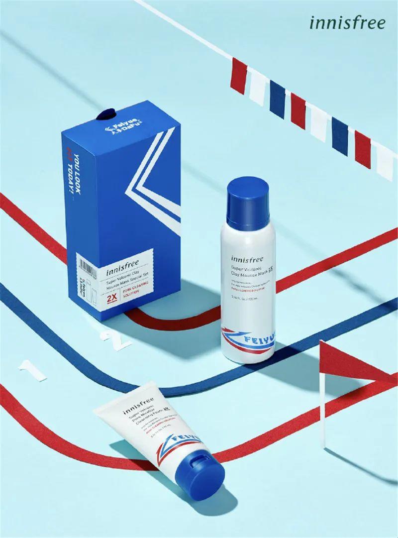 該系列以火山巖泥為主要成分,包括卸妝水、慕斯面膜、潔面乳、防曬霜等產(chǎn)品。包裝上以藍(lán)、白、紅為主色調(diào),并融入了大孚飛躍經(jīng)典藍(lán)紅的LOGO,呈現(xiàn)青春、酷爽感。