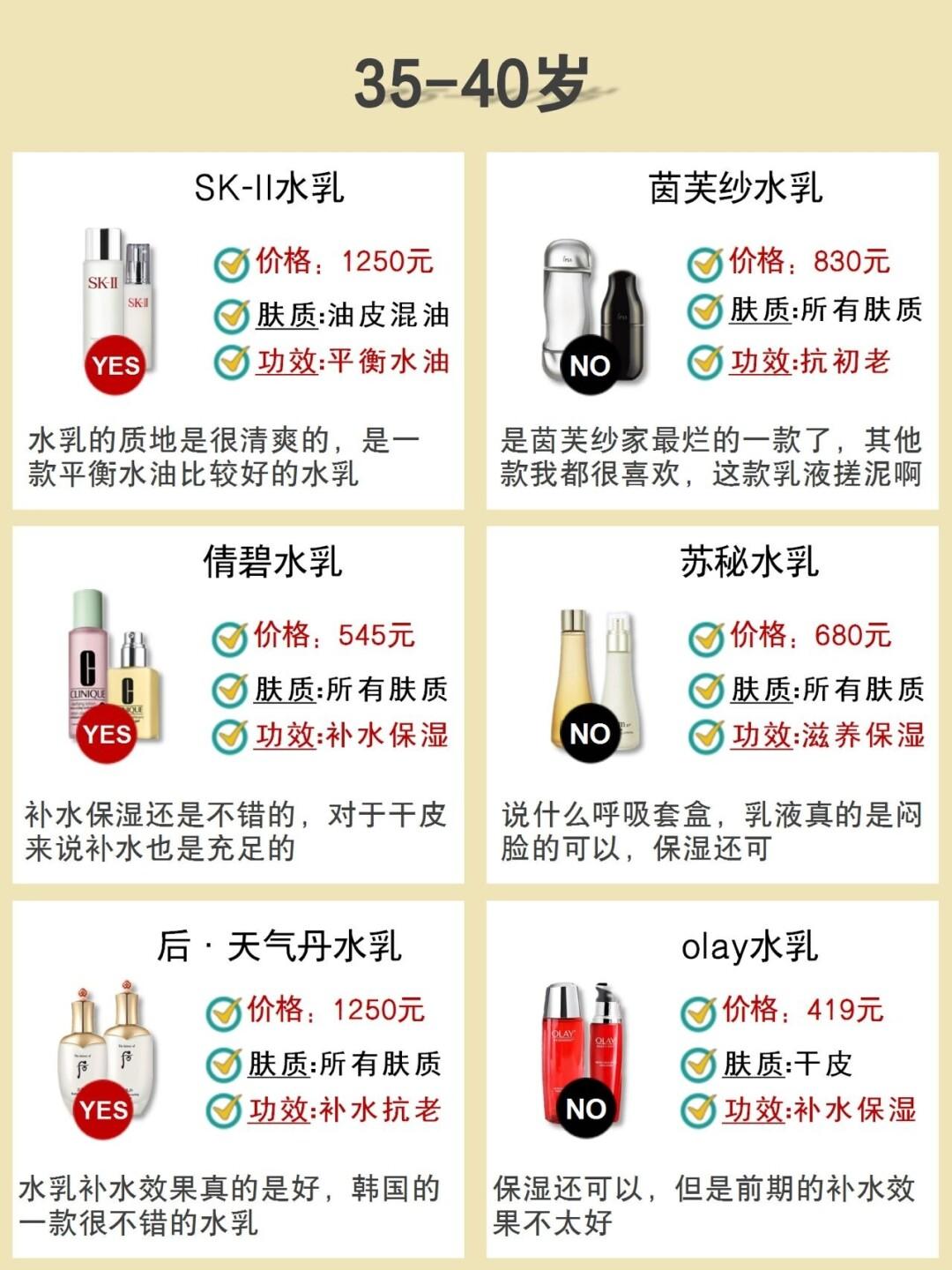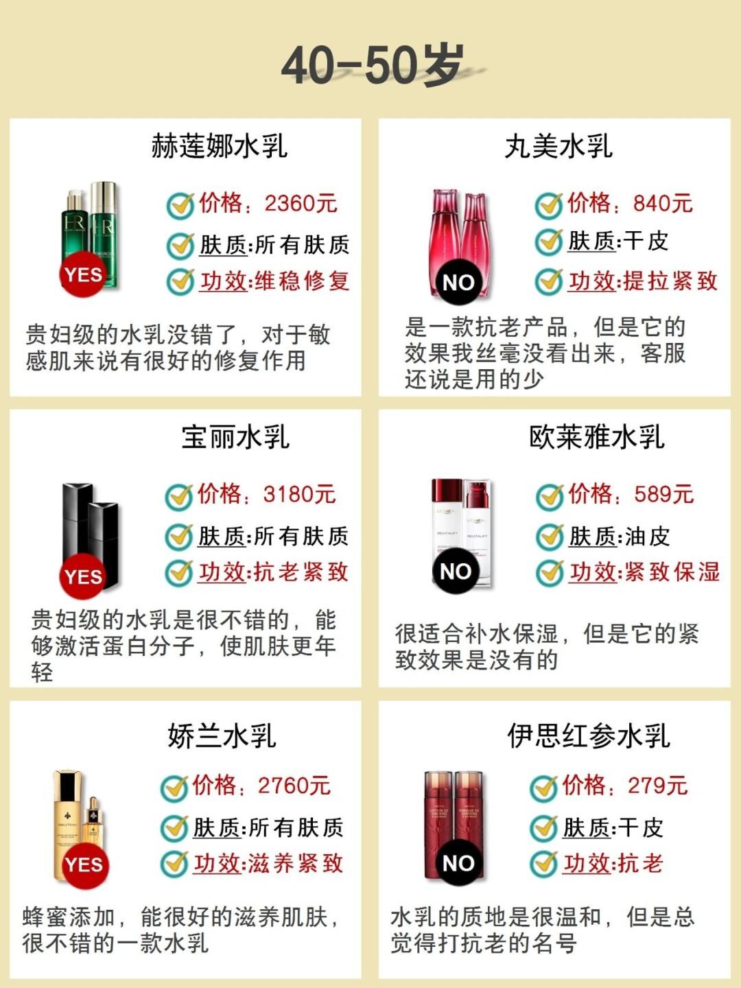 35~50歲:雅詩蘭黛智妍面霜、阿瑪尼黑鑰匙面霜、蘭蔻精粹面霜、赫蓮娜黑繃帶面霜、紀梵希黑藻面霜