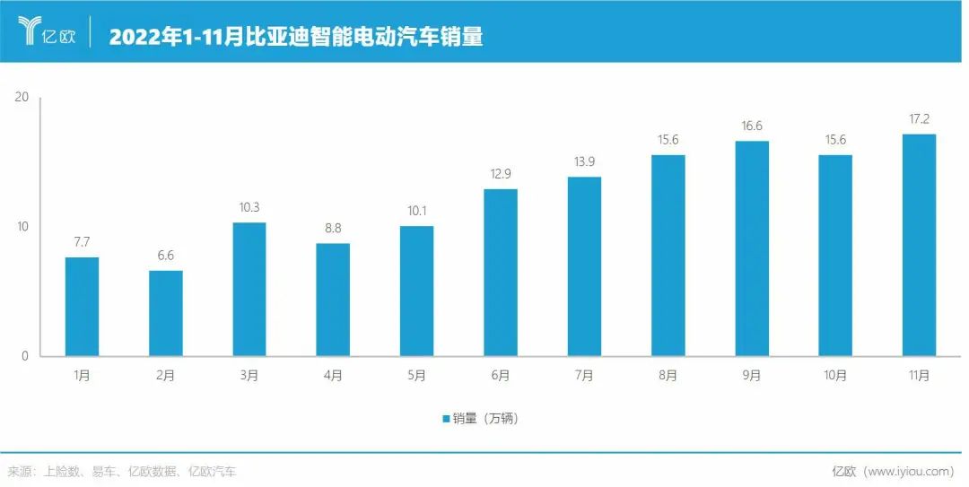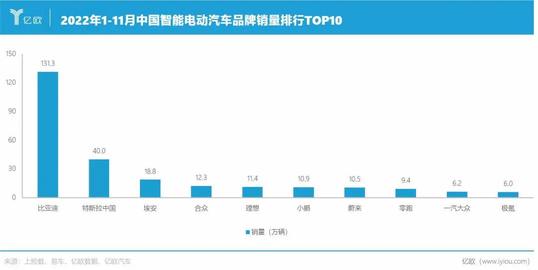 據(jù)億歐汽車(chē)&億歐數(shù)據(jù)統(tǒng)計(jì),2022年1-11月,比亞迪以131.3萬(wàn)輛的智能電動(dòng)汽車(chē)(SEV)銷(xiāo)量獨(dú)占鰲頭,身后選手難以望其項(xiàng)背,哪怕是勢(shì)頭鼎盛的特斯拉。