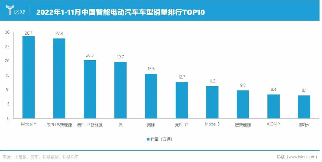 在2022年1-11月中國(guó)智能電動(dòng)汽車(chē)(SEV)車(chē)型銷(xiāo)量排行TOP10中,Model Y、宋PLUS、秦PLUS、漢、海豚霸榜前五名。無(wú)論轎車(chē)還是SUV,純電動(dòng)還是PHEV,比亞迪憑借豐富的產(chǎn)品矩陣占據(jù)了0車(chē)型榜的7個(gè)席位。