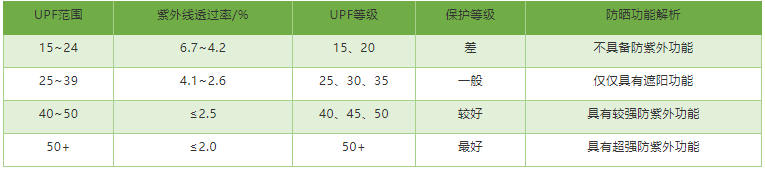 UPF 的數(shù)值及防護(hù)等級如下表所示: