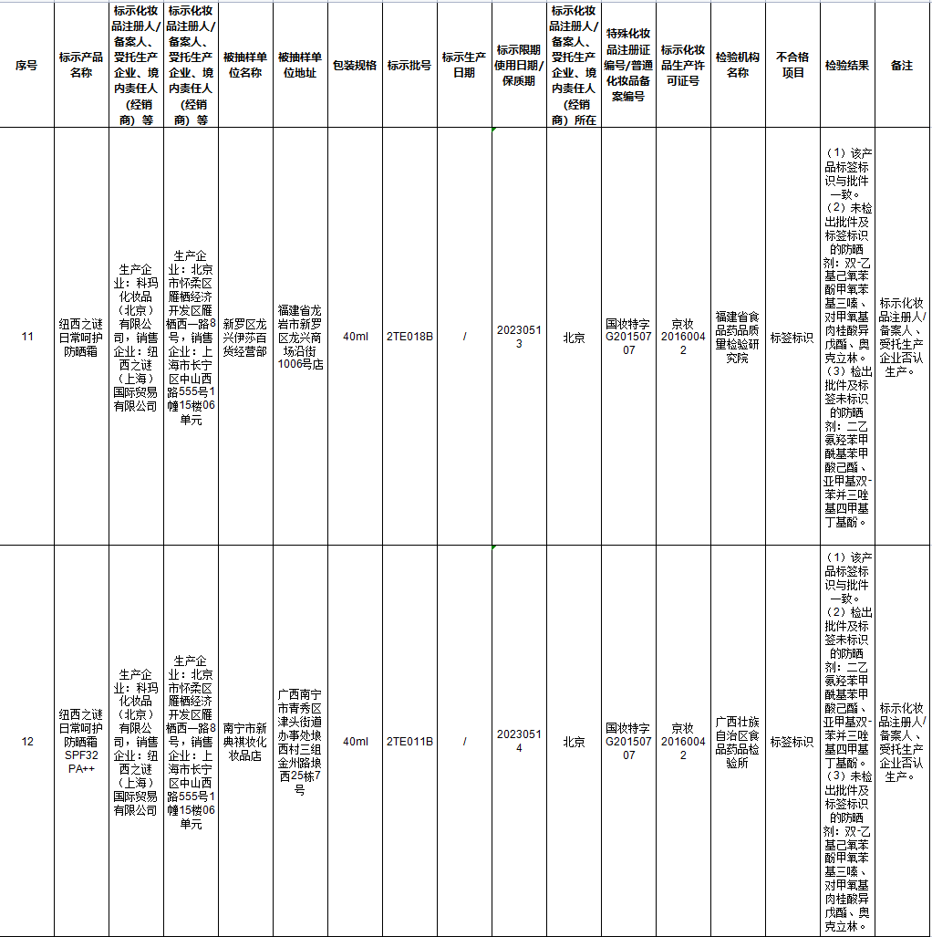 一批次標(biāo)示名稱為紐西之謎日常呵護(hù)防曬霜SPF32 PA++、標(biāo)示生產(chǎn)企業(yè)為科瑪化妝品(北京)有限公司、銷售企業(yè)為紐西之謎(上海)國際貿(mào)易有限公司、標(biāo)示特殊化妝品注冊(cè)證編號(hào)/普通化妝品備案編號(hào)為國妝特字G20150707、標(biāo)示批號(hào)為2TE011B的產(chǎn)品,被檢出標(biāo)簽標(biāo)識(shí)不合格,不合格項(xiàng)目為檢出批件及標(biāo)簽未標(biāo)識(shí)的防曬劑:二乙氨羥苯甲?;郊姿峒乎?、亞甲基雙-苯并三唑基四甲基丁基酚;未檢出批件及標(biāo)簽標(biāo)識(shí)的防曬劑:雙-乙基己氧苯酚甲氧苯基三嗪、對(duì)甲氧基肉桂酸異戊酯、奧克立林。同時(shí)備注:標(biāo)示化妝品注冊(cè)人/備案人、受托生產(chǎn)企業(yè)否認(rèn)生產(chǎn)。