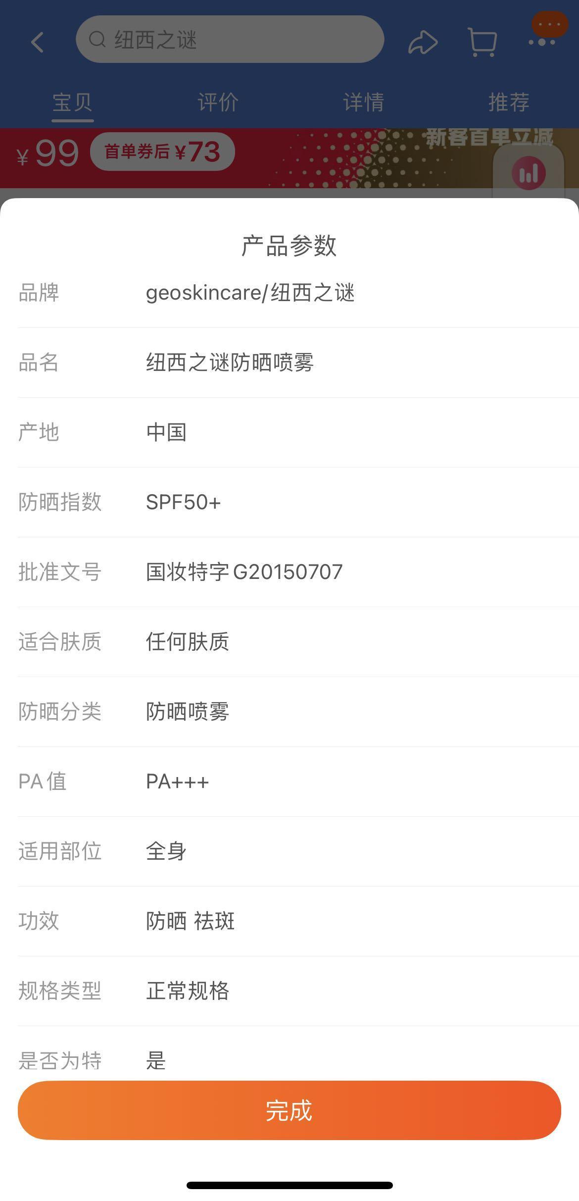 南都記者查詢到,目前紐西之謎官方旗艦店在售的防曬產(chǎn)品為一款防曬噴霧,批準(zhǔn)文號(hào)為國妝特字G20150707(與藥監(jiān)局此次抽檢產(chǎn)品備案編號(hào)相同)。產(chǎn)品月銷400+,評(píng)論9000+。