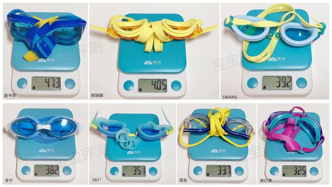 6、7款兒童泳鏡的重量在32.5g—47.3g之間,迪卡儂重,速比濤輕。