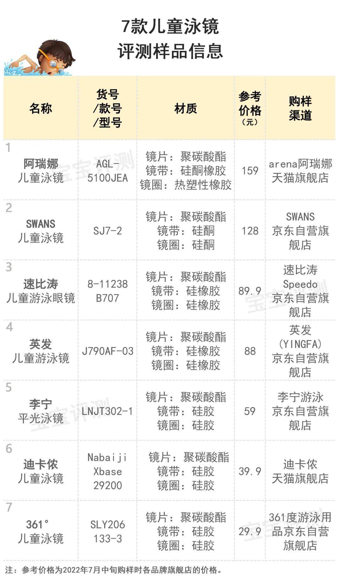 評測樣品綜合電商平臺銷量、品牌知名度及關(guān)注度,本期笨爸爸選擇了7款兒童泳鏡進(jìn)行評測,包括:阿瑞娜、SWANS、速比濤、英發(fā)、李寧、迪卡儂、361°。