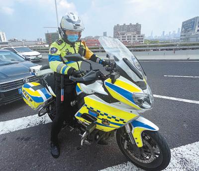 南京市交管局鐵騎中隊(duì)隊(duì)員陳麟麟剛從固定崗位換班,準(zhǔn)備騎著摩托車(chē)去巡邏。記者 姚雪青攝