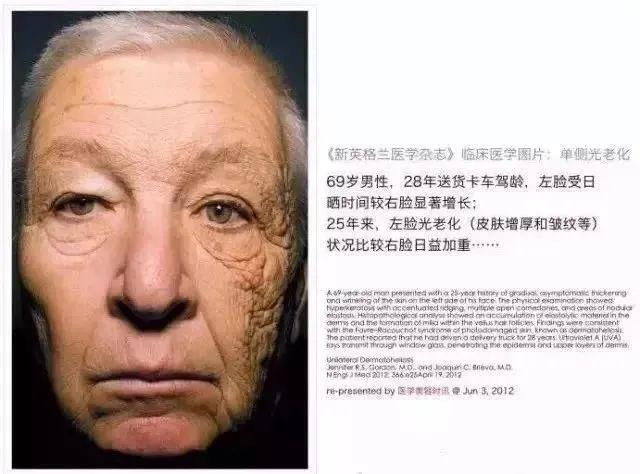 英格蘭的一位送奶工,因?yàn)殚_車時(shí)左臉靠近窗戶一邊,導(dǎo)致左臉長期受到紫外線的照射。