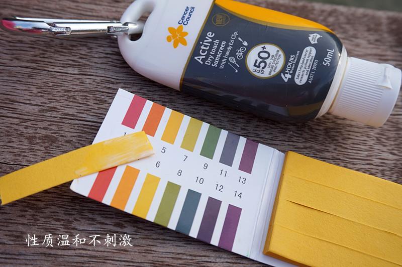 所有Cancer Council的防曬品都依據(jù)現(xiàn)行世界上嚴(yán)格的防曬測(cè)試條例,不含酒精,防腐劑,色素,香料等敏感成分,無刺激。用PH試紙測(cè)試了一下,健康人的皮膚通常呈現(xiàn)中性或弱酸性,所以我們涂在皮膚上的護(hù)膚品也應(yīng)該是近似的酸堿度。經(jīng)過測(cè)試,防曬霜的PH值在5—6之間呈弱酸性,溫和無刺激哦,這下可以放心使用啦。