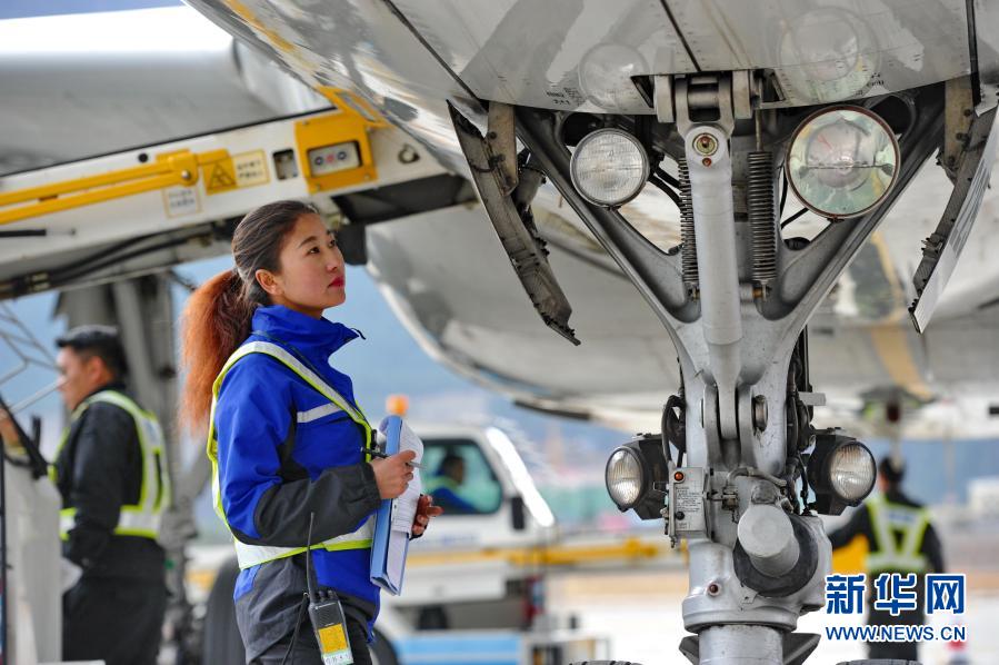 在西藏林芝米林機(jī)場(chǎng),機(jī)械師瑪麗亞在繞機(jī)檢查(2017年3月6日攝)。新華社記者 張汝鋒 攝
