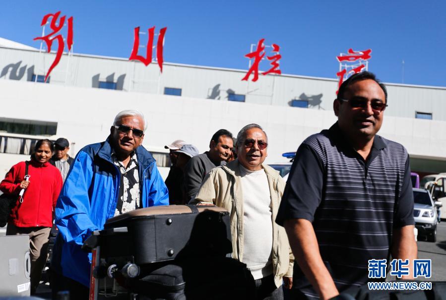 印度游客走出拉薩貢嘎機(jī)場(chǎng)(2013年9月27日攝)。新華社記者 普布扎西 攝