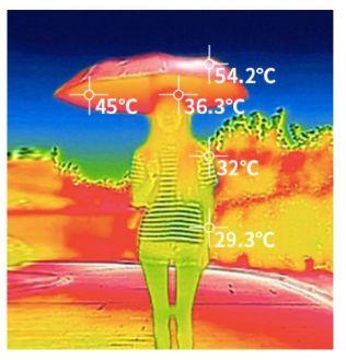 L.R.C.涂層運(yùn)用于傘面阻擋熱量能力極強(qiáng)。在專業(yè)的熱感儀實(shí)驗(yàn)中,我們可以清晰地看到雙層傘布的卓越隔熱果,有降低熱量傳導(dǎo),遮熱果可以讓溫度驟降12攝氏度,傘內(nèi)傘外體感簡直是兩個世界。