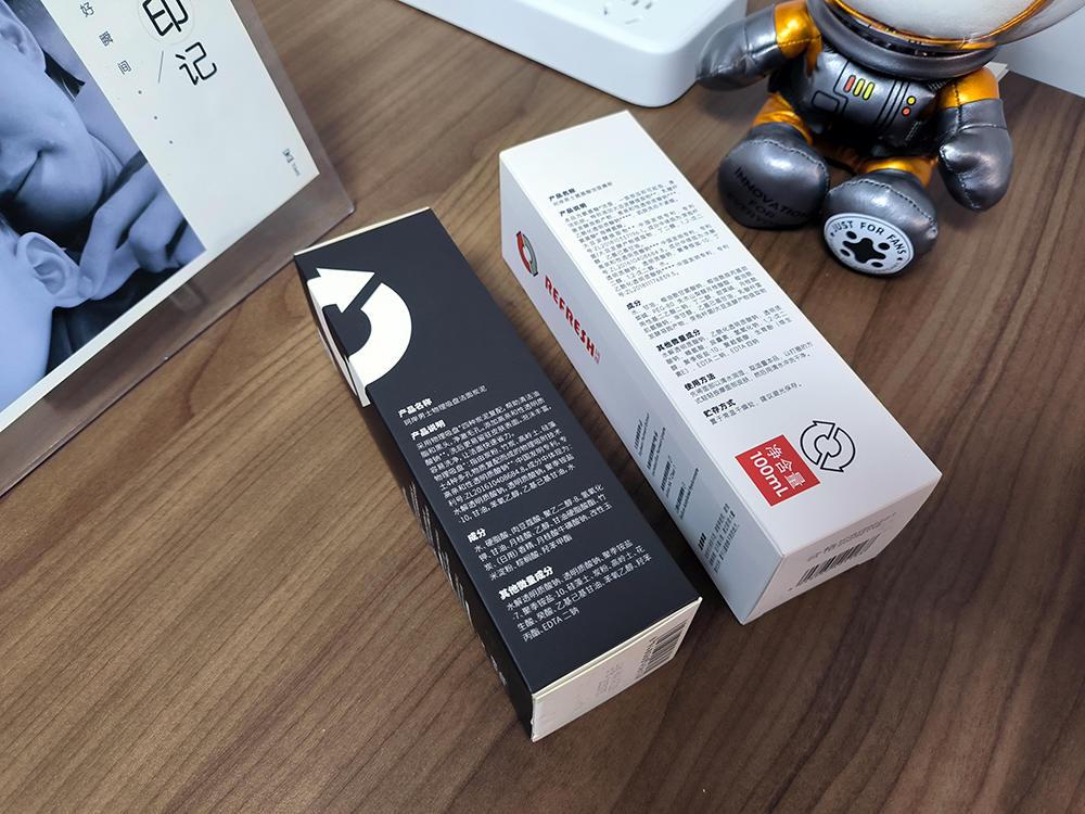 兩個(gè)獨(dú)立的包裝,一黑一白的精致紙盒。頂部印有開啟刷新廣告語,應(yīng)該是寓意著面部皮膚每天都能改變一點(diǎn)。外包裝所展示的內(nèi)容極其豐富,產(chǎn)品的功能特征以及產(chǎn)品說明、成分介紹、使用方法等等均有細(xì)致展示。