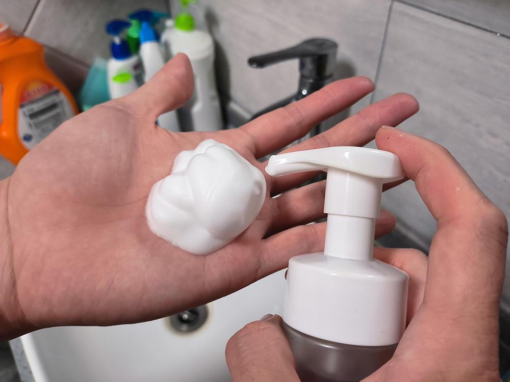 在實(shí)際使用過程中,氨基酸大豆?jié)嵜婺剿褂弥娣奖?。清水撲面過后,按壓一泵到泡沫到手心即可,完全節(jié)省了膏狀掌心揉搓的過程。通過手掌鋪開展示,泡沫細(xì)膩且均勻,直接涂在臉上即可。使用感受很溫和,沒有任何的刺激感。清水沖洗過后面部肌膚的舒適,無任何緊繃感。其皮膚表面有持久的保濕果,水潤不干燥。