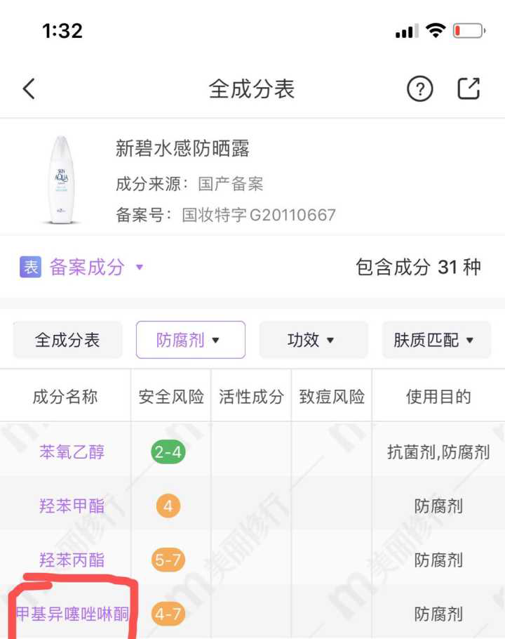 例如下圖這款新碧水感防曬露,防腐劑有四種,其中MIT防腐劑屬于高危致敏防腐劑