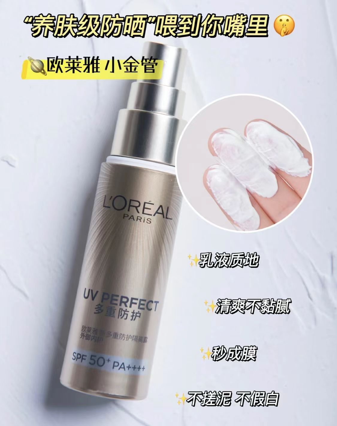 這款是歐萊雅集團的專利防曬,是一款純化學(xué)防曬,主打抗老級防曬,防曬的同時還能養(yǎng)膚補水。