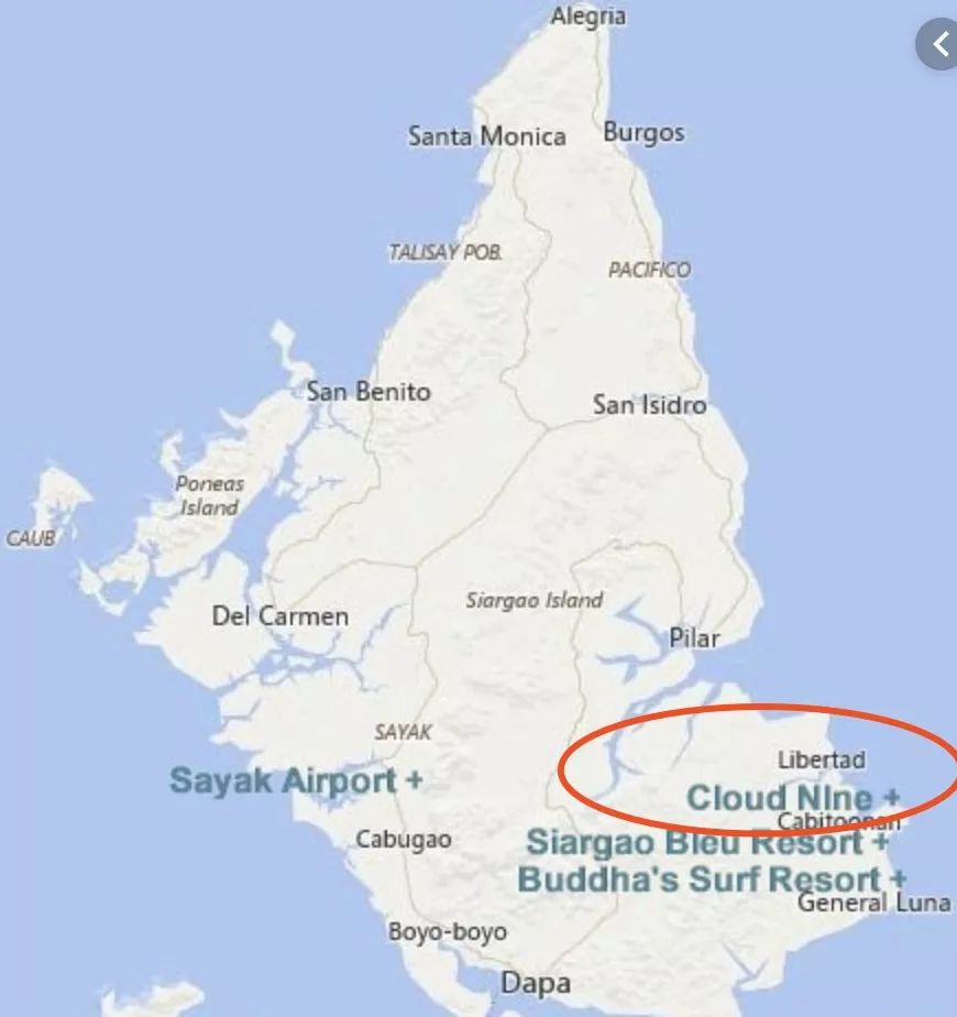 除了有名的Cloud 9,其實(shí)錫亞高其他好沖的地方也不少,下圖有標(biāo)明小圈圈的,都是錫亞高的沖浪好地。