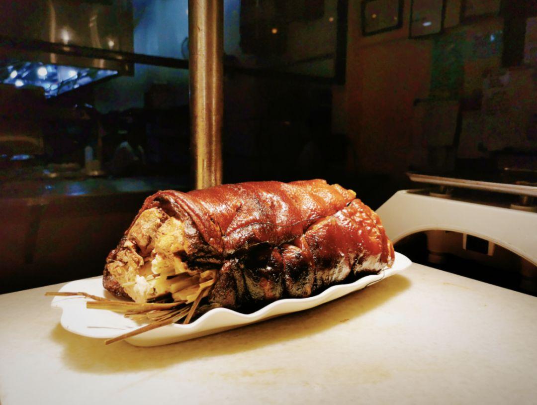 有名的烤豬肉被裝在豬頭盤(pán)子里,皮被烤得很脆,與牙齒碰撞,會(huì)有清脆的聲音與在口腔里回蕩。豬肉也烤得很嫩,口感是Q彈的,用烤的方式,能大化地釋放出豬肉本身的香味。