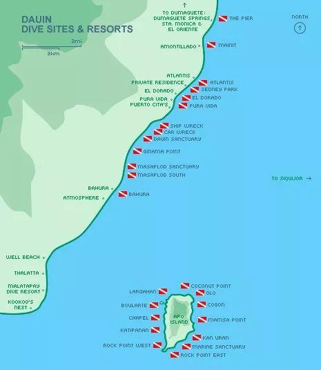 沿著海岸線,標(biāo)注紅色點(diǎn)的,都是不錯(cuò)的潛水地。以及右下角的阿波島(Apo Island),環(huán)繞小島一圈都好潛。