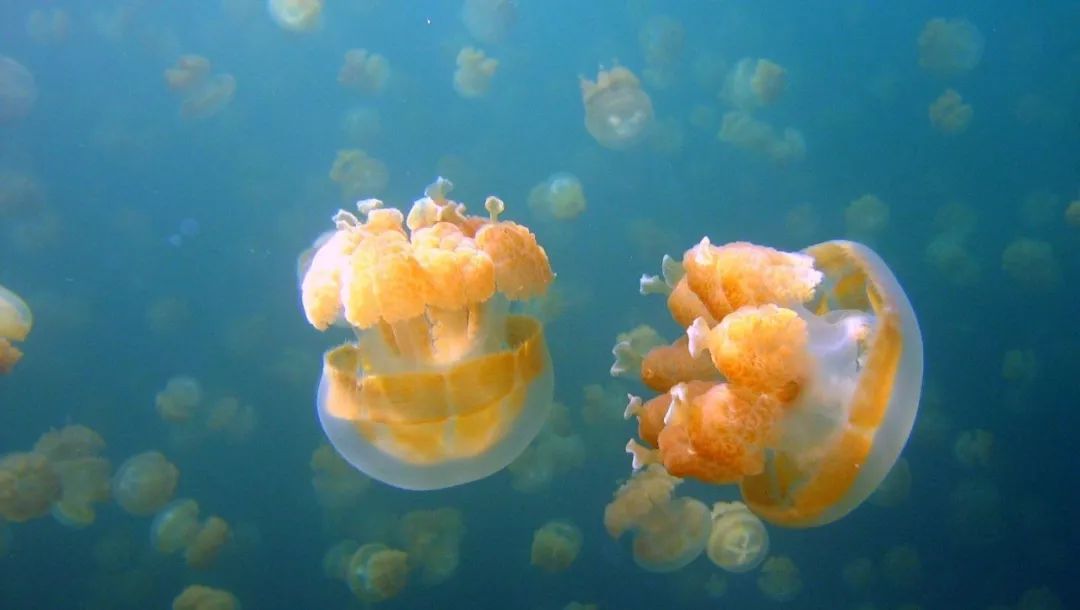 坐在小舟上,你會(huì)完全想不到水下有那么多水母在蹦迪。這時(shí)你可以拿著浮潛設(shè)備,把腦袋和身體探進(jìn)水里,友善地與“小果凍”們打招呼。