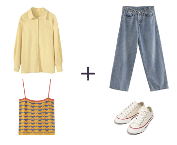 1、民族風(fēng)吊帶+防曬襯衫+牛仔闊腿褲