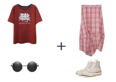 4、半身不規(guī)則長裙+卡通短袖+復(fù)古太陽鏡
