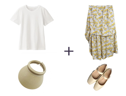 5、碎花半身長裙+白色短袖+個性太陽帽+方頭小皮鞋