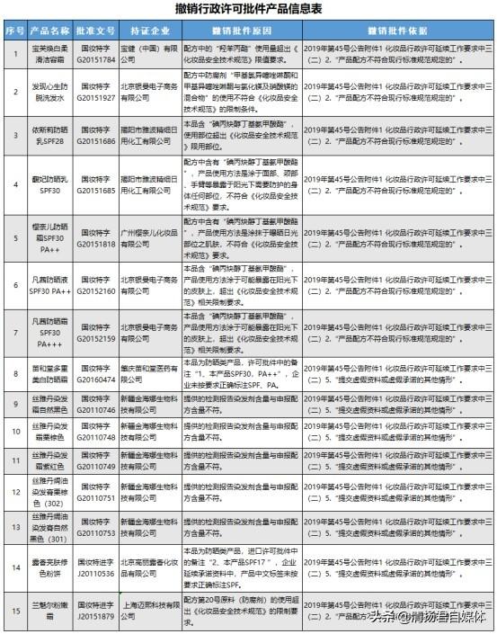 小編仔細閱讀《附件:撤銷行政許可批件產(chǎn)品信息表》,發(fā)現(xiàn)這15個被禁產(chǎn)禁銷特殊用途化妝品涉及美白霜、洗發(fā)水、防曬、染發(fā)膏等多個品類。