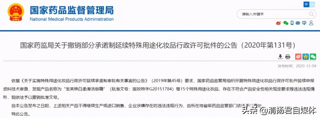近日,藥監(jiān)局發(fā)布的《關(guān)于撤銷部分承諾制延續(xù)特殊用途化妝品行政許可批件的公告》(2020年第131號)稱,產(chǎn)品名為“寶芙煥白柔滑潔容霜”(批準文號:國妝特字G20151784)等15個特殊用途化妝品,存在不符合產(chǎn)品性相關(guān)規(guī)定要求等違法違規(guī)情形,現(xiàn)依法予以撤銷批準文號。自本公告發(fā)布之日起,上述相關(guān)產(chǎn)品不得繼續(xù)生產(chǎn)或進口銷售,企業(yè)涉嫌存在的違法違規(guī)行為,由所在地省級藥品監(jiān)管部門依法予以查處。
