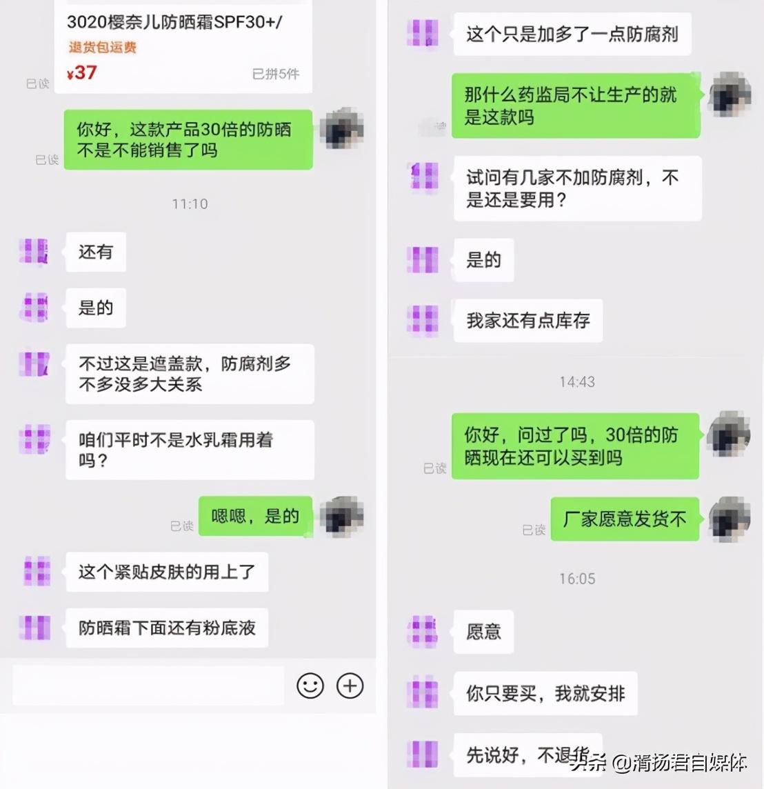 然而小編通過搜索發(fā)現(xiàn),被涉及的7款防曬產(chǎn)品大部分已從各大電商平臺下架,但仍有部分產(chǎn)品在市場上銷售,比如櫻奈兒防曬霜SPF30PA++。該產(chǎn)品在拼多多平臺上至少還有三家店鋪在銷售,而且其中一家店的客服告訴小編,因為大家平時用乳霜,該款產(chǎn)品雖然防腐劑加多了,但并不直接接觸皮膚,對皮膚沒什么影響,如果需要還有庫存,但是購買后不退貨。