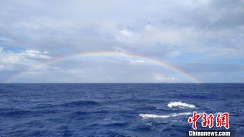 遠(yuǎn)望7號(hào)左舷,橫跨在湛藍(lán)海水上的彩虹。 溫孟馨 攝