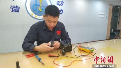 遠(yuǎn)望7號(hào)電工馬洪宇幫記者修好了電池。 溫孟馨 攝