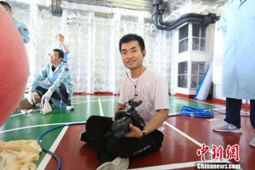 遠(yuǎn)望7號(hào)船攝影師王哲在直升機(jī)庫里拍攝測控工程師的工作。 韓帥 攝