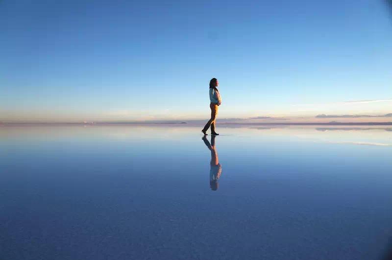 而我們看到的天空之鏡,就是鹽沼上覆蓋一層水時的鏡面果。能呈現(xiàn)天地一色的感覺,一個是因為廣闊,烏尤尼面積達9000平方公里,一個海拔高,3600多米,所以有那種高原特有的透亮的藍天;再有就是平,所以在有幾厘米的水層覆蓋時,就有鏡面果。