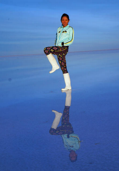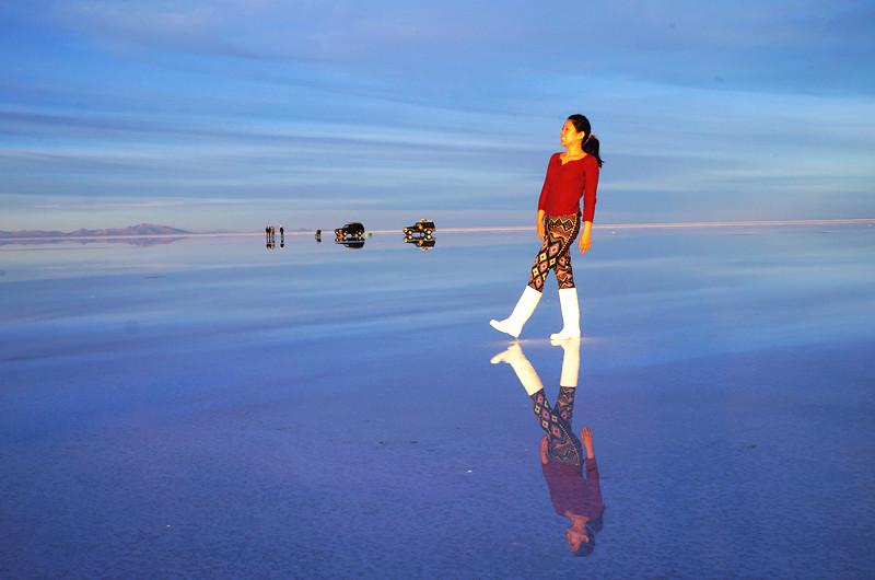 好比這一幅,雨季來的,水沒有問題,當天的天空屬于有薄薄的云層,容易形成晚霞,但不是有型的云(有完全無云的時候,還有雨后大朵的云,其實各種形態(tài)各有味道,都很好看);司機選擇的地點不太好,后面有小山,如果沒有山,地平線會窄成一絲至消失,天地完全連成一色更美,另外前面有露出的鹽腳下也有雜物,也影響果;拍照水平,首先,模特沒有問題(嘻嘻,模特是lena當然沒有問題),但拍得角度高了,地平線出現(xiàn)在膝蓋位置,如果相機放低,離遠點用長焦拉近,讓地平線接近腳底,就會有的鏡面圖啦。