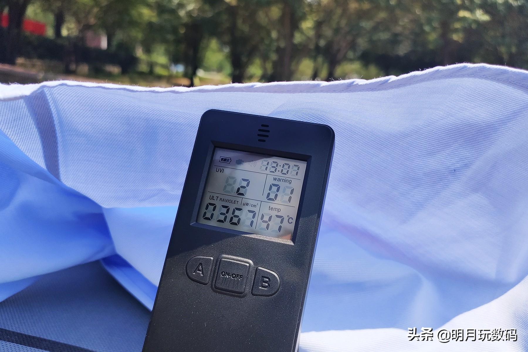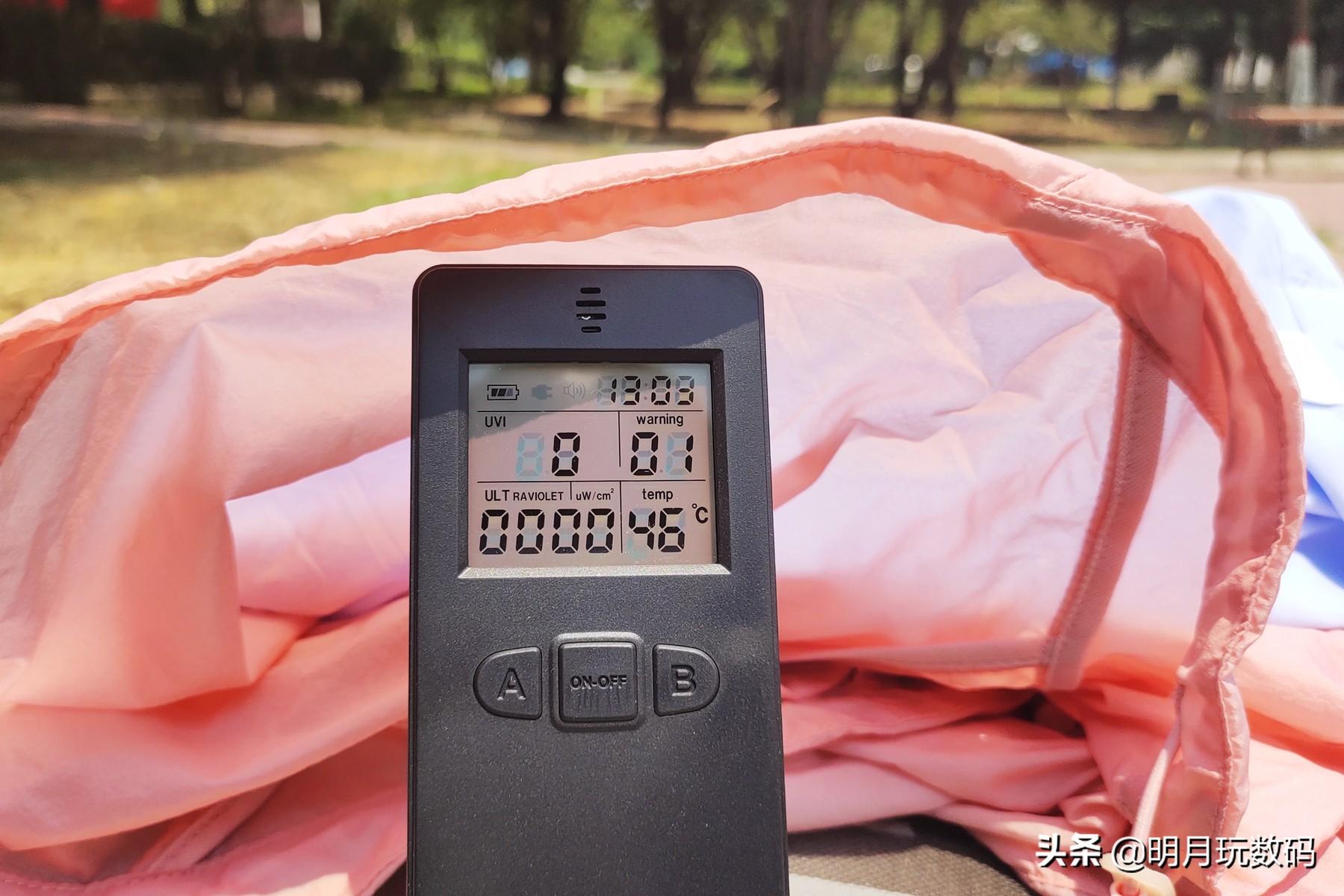 這次對防曬衣的帽子、前襟和腋下鏤空的部位進(jìn)行了多次測試。只要將防曬衣遮擋住測試儀,終的結(jié)果無論那個部位,測得紫外線指數(shù)都為0。因?yàn)殚L時間在烈日下,儀表測試溫度已達(dá)到了47度,手拿著測試儀都有點(diǎn)燙手了,這個溫度應(yīng)該還是準(zhǔn)確的。