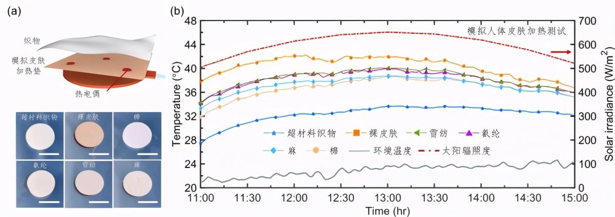 超材料織物與商用織物降溫性能對(duì)比測(cè)試:(a)測(cè)試裝置示意圖和樣品照片(b)超材料織物制冷性能對(duì)比測(cè)試曲線圖(廣州,2020年11月28日)。受訪者供圖