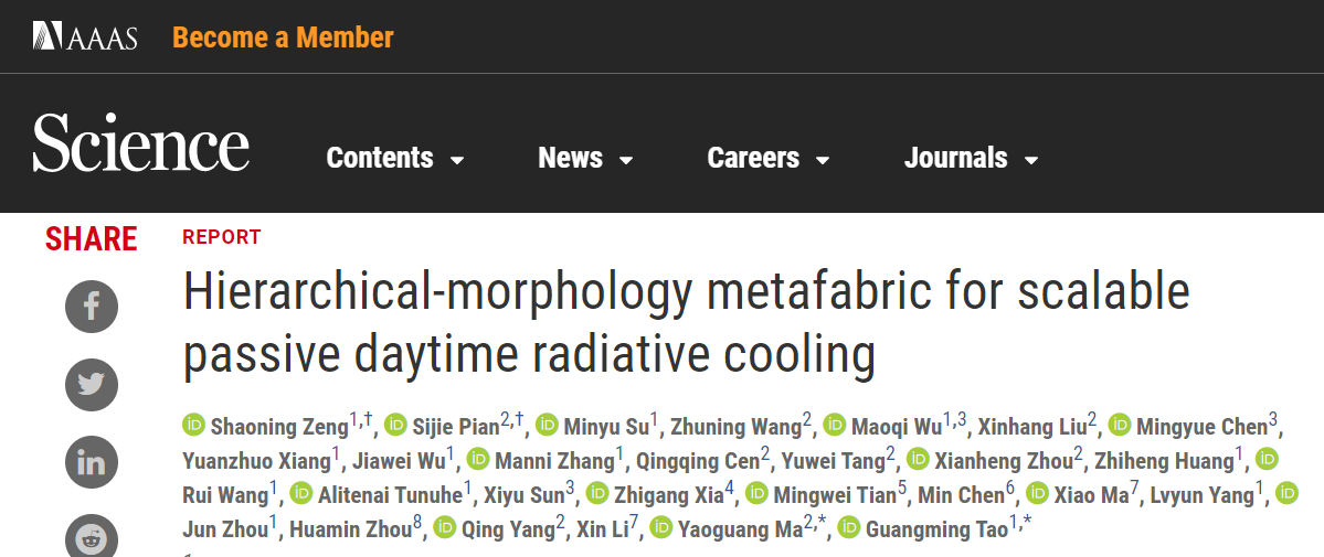 用科學(xué)術(shù)語(yǔ)說(shuō),“超構(gòu)織物”能夠通過(guò)分級(jí)形態(tài)設(shè)計(jì),調(diào)諧對(duì)太陽(yáng)光波段和中紅外波段的光學(xué)響應(yīng)。既保持8~13微米波段的高發(fā)射率,大化熱輻射;又對(duì)0.3~2.5微米的太陽(yáng)輻射實(shí)現(xiàn)高阻擋,實(shí)現(xiàn)在無(wú)能源輸入條件下,對(duì)覆蓋目標(biāo)物的全天持續(xù)進(jìn)行降溫,且綠色環(huán)保、柔軟親膚、舒適透氣。再用科學(xué)思路說(shuō),“超構(gòu)織物”是用物理光學(xué)和材料科學(xué)的協(xié)同創(chuàng)新來(lái)實(shí)現(xiàn)被動(dòng)式降溫,替代傳統(tǒng)的主動(dòng)降溫方式,意味著它是環(huán)境友好的、可持續(xù)發(fā)展的、順應(yīng)“碳達(dá)峰、碳中和”的綠色理念。